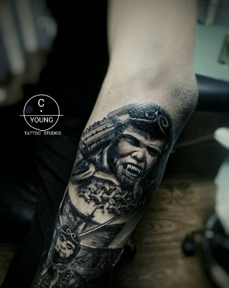 当前位置: 首页 >江西省上饶市纹身店-兮阳刺青纹身图案>大话西游纹身图片_手臂手部传统肖像写实大话西游成品纹身图案