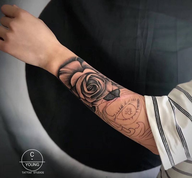 • 手背潮流时尚的玫瑰花眼睛纹身图案