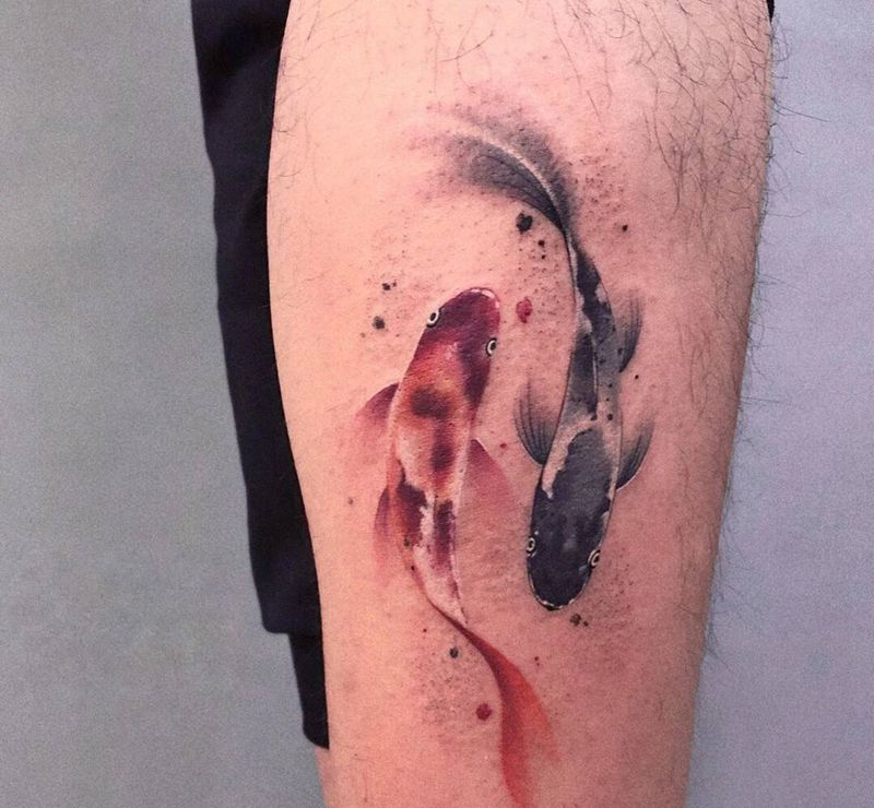 水墨鱼纹身图片_腿部水彩水墨纹身图案