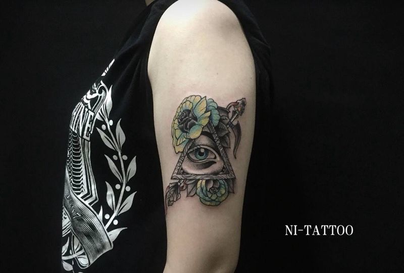 当前位置: 首页 >山东省济南市纹身店-拾遗刺青纹身图案>上帝之眼纹身图片_成品手臂欧美几何纹身图案