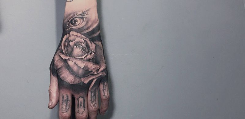 • 手背潮流时尚的玫瑰花眼睛纹身图案