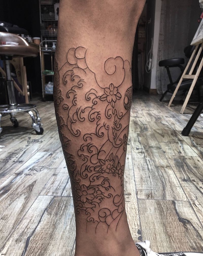 • T网红王老大花腿龙纹身图片_腿部新传统纹身图案