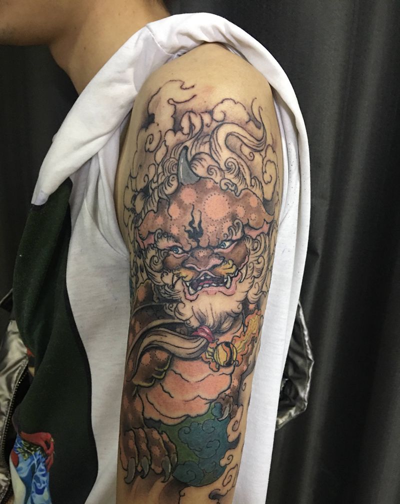 当前位置: 首页 >江西省上饶市纹身店-玖柒刺青纹身图案>新传统唐狮纹身图片_手臂纹身图案