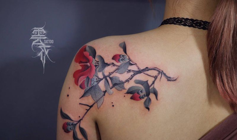 当前位置: 首页 >山东省济南市纹身店-云衣刺青纹身图案>茶花纹身图片_肩部手臂水墨纹身图案