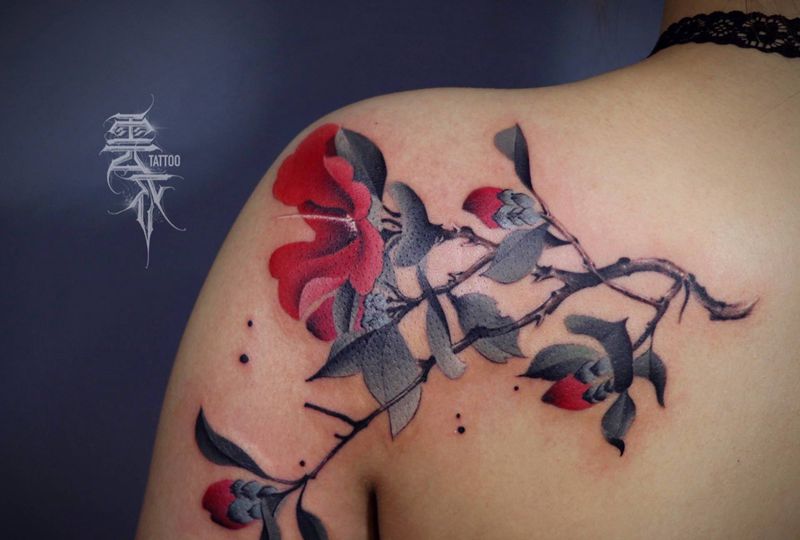 当前位置: 首页 >山东省济南市纹身店-云衣刺青纹身图案>茶花纹身图片_肩部手臂水墨纹身图案
