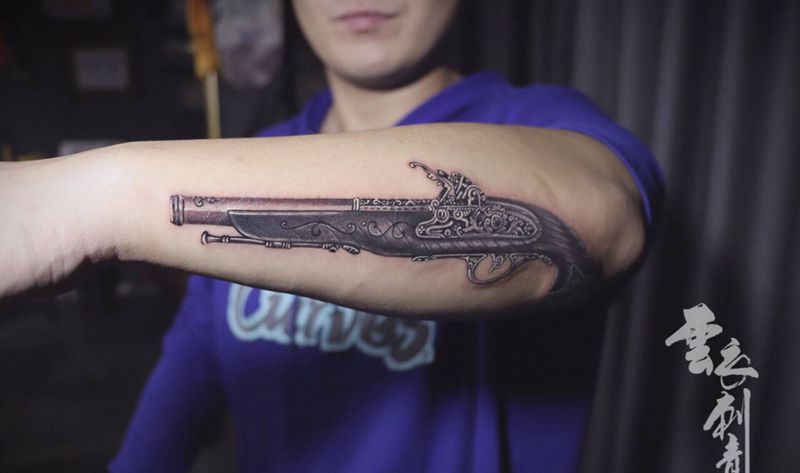 当前位置: 首页 >山东省济南市纹身店-云衣刺青纹身图案>火枪纹身图片_手臂欧美写实纹身图案