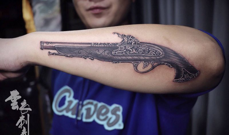 当前位置: 首页 >山东省济南市纹身店-云衣刺青纹身图案>火枪纹身图片_手臂欧美写实纹身图案