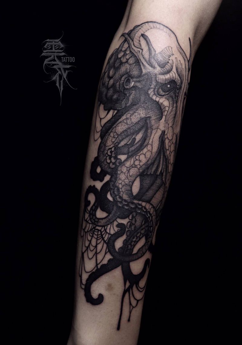 当前位置: 首页 >山东省济南市纹身店-云衣刺青纹身图案>暗黑章鱼纹身图片_手臂点刺水墨章鱼纹身图案