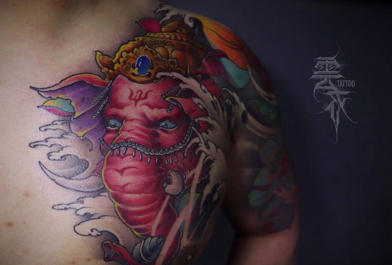 当前位置: 首页 >山东省济南市纹身店-云衣刺青纹身图案>象神纹身图片_胸部新传统纹身图案