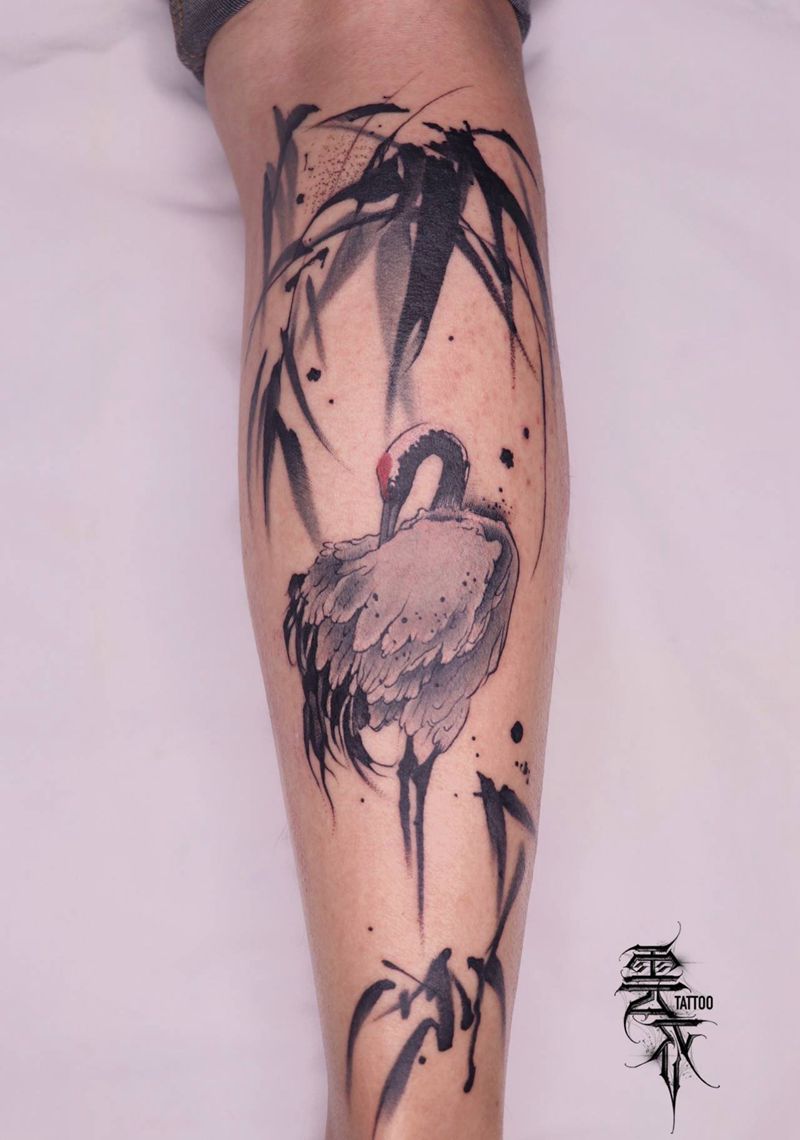 竹鹤纹身图片_腿部水墨纹身图案