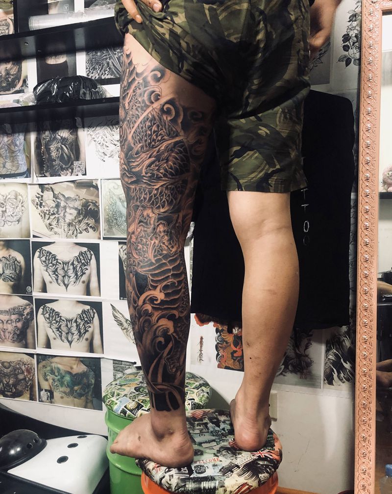 • T网红王老大花腿龙纹身图片_腿部新传统纹身图案