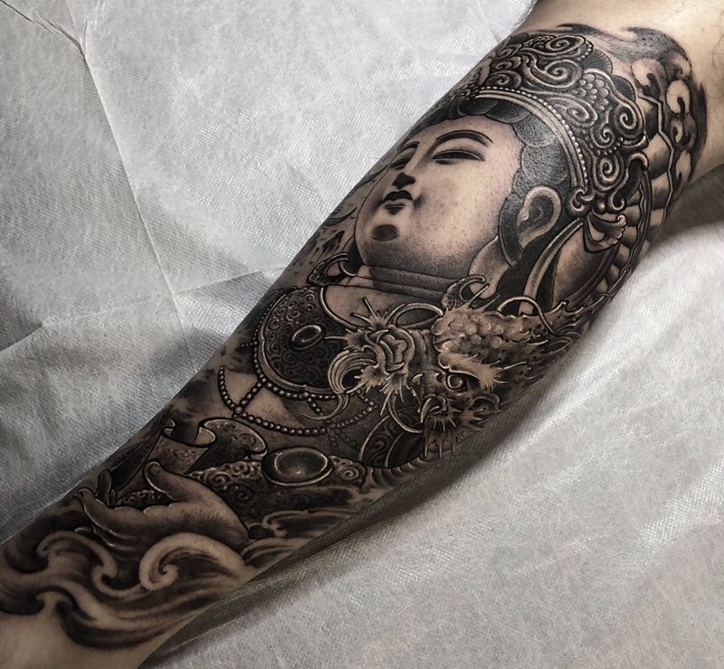 当前位置: 首页 >山东省济南市纹身店-青松TATTOO纹身图案>普贤菩萨纹身图片_腿部新传统菩萨纹身图案