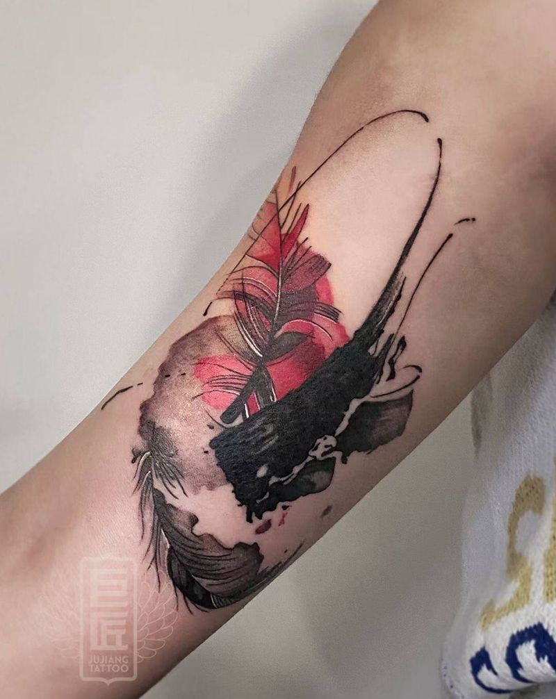 遮盖作品纹身图片_手臂水墨羽毛纹身图案