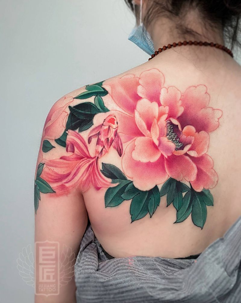 当前位置: 首页 >山东省济南市纹身店-济南巨匠刺青纹身图案>富贵牡丹纹身图片_肩部手臂新传统牡丹,鱼纹身图案