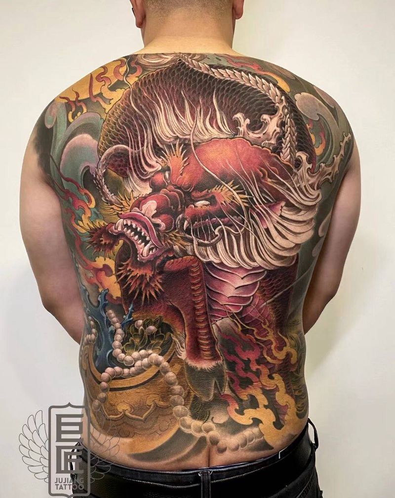 当前位置: 首页 >山东省济南市纹身店-济南巨匠刺青纹身图案>满背大麒麟纹身图片_背部新传统水彩麒麟纹身图案