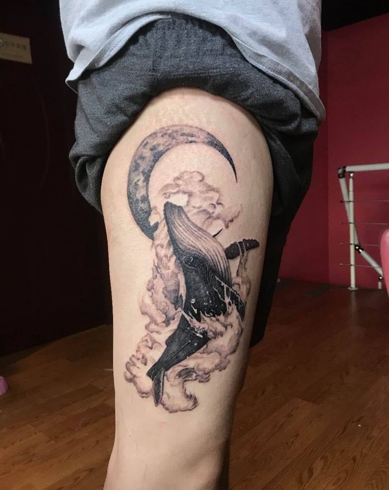 • T网红王老大花腿龙纹身图片_腿部新传统纹身图案