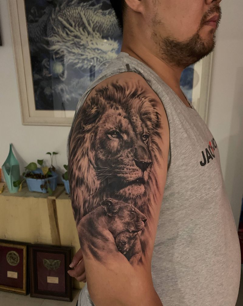 当前位置: 首页 >山东省济南市纹身店-济南纹彩刺青纹身图案>狮子一家子纹身图片_手臂欧美写实纹身图案