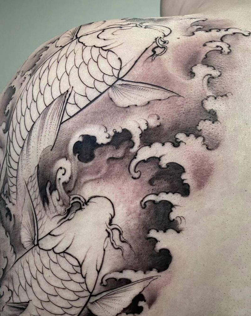 “竞游”纹身图片_背部新传统锦鲤浪纹身图案