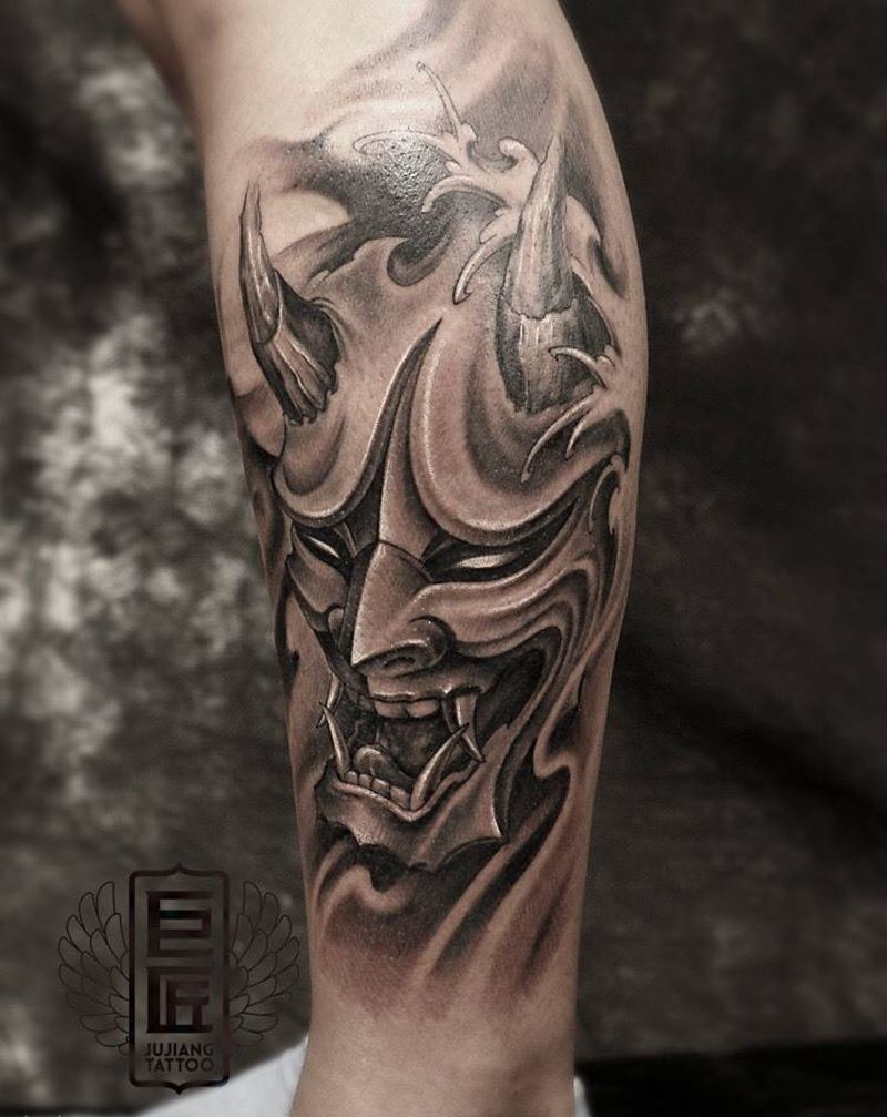 般若纹身图片_成品腿部传统鬼神纹身图案