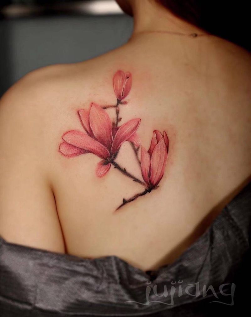 当前位置: 首页 >山东省济南市纹身店-济南巨匠刺青纹身图案>玉兰花纹身图片_成品肩部清新植物原创培训纹身图案