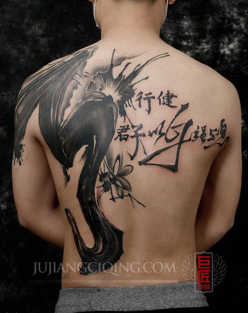 当前位置: 首页 >山东省济南市纹身店-济南巨匠刺青纹身图案>水墨风“天行健”纹身图片_成品肩部背部国画字符纹身图案