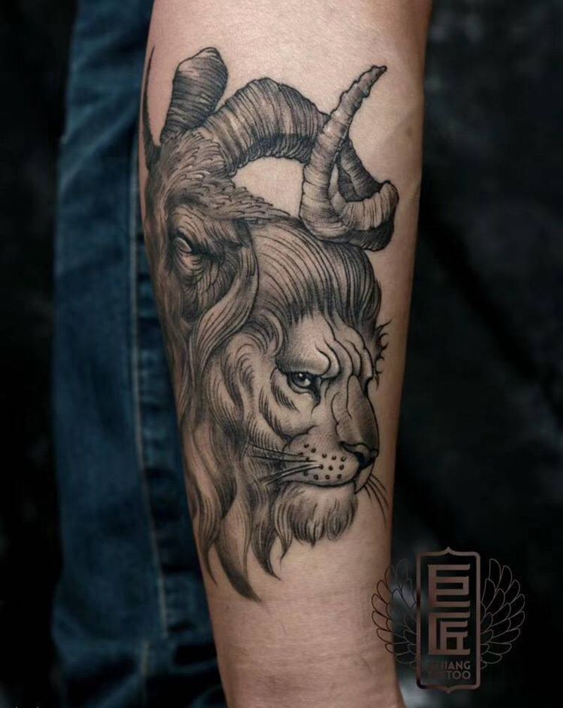 摩羯与狮子的合影纹身图片_成品腿部传统动物培训原创纹身图案