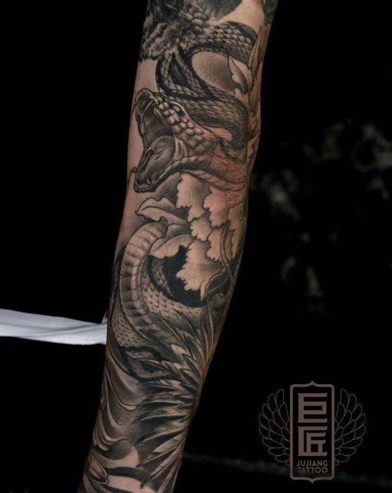 • T网红王老大花腿龙纹身图片_腿部新传统纹身图案