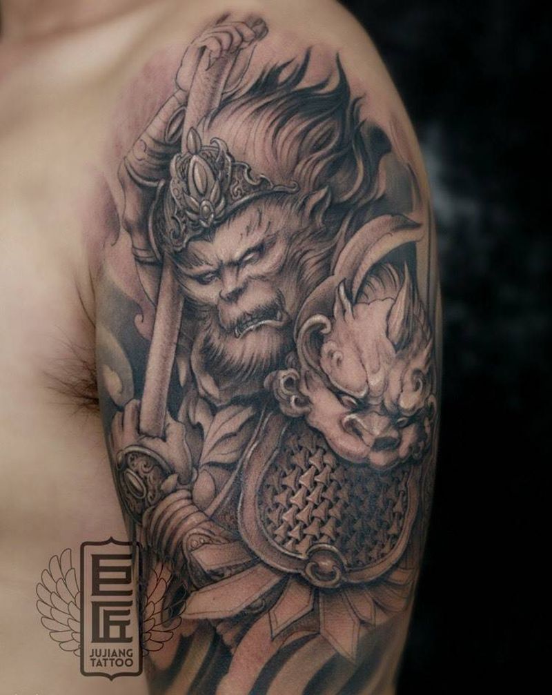 当前位置: 首页 >山东省济南市纹身店-济南巨匠刺青纹身图案>悟空纹身图片_成品手臂传统人物原创培训纹身图案