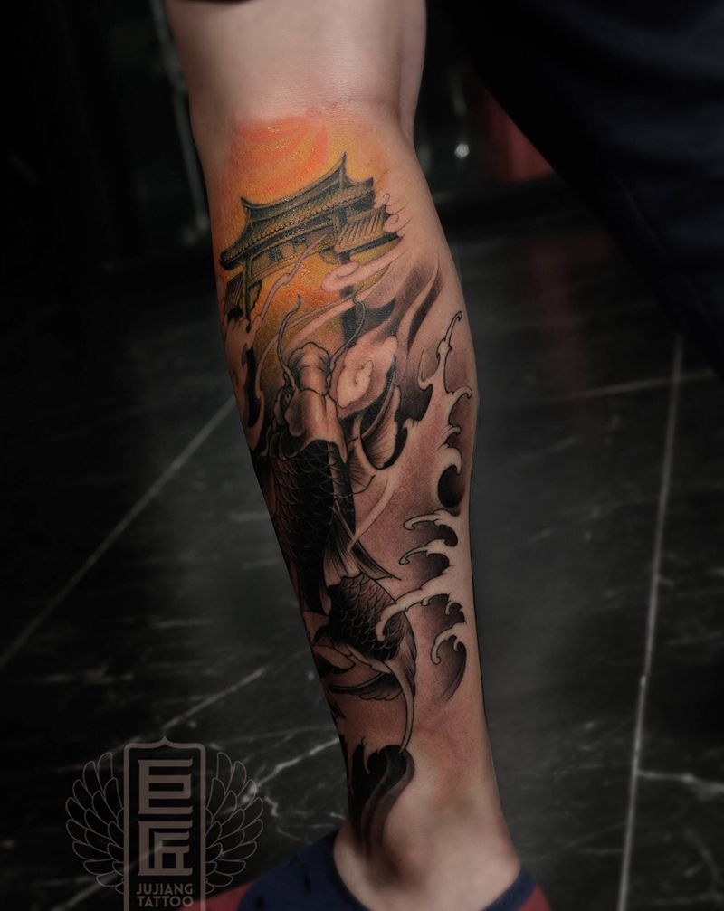 当前位置: 首页 >山东省济南市纹身店-济南巨匠刺青纹身图案>鲤跃金门纹身图片_腿部新传统纹身图案