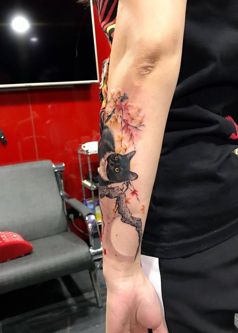 当前位置: 首页 >山东省济南市纹身店-烈火堂纹身纹身图案>猫纹身图片_手臂新传统纹身图案