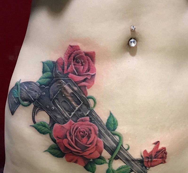 当前位置: 首页 >山东省济南市纹身店-烈火堂纹身纹身图案>枪炮玫瑰纹身图片_成品手稿腹部欧美清新植物原创纹身图案