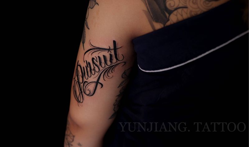 当前位置: 首页 >山东省济南市纹身店-初代彫雲川刺青纹身图案>追赶纹身图片_手臂花体字纹身图案