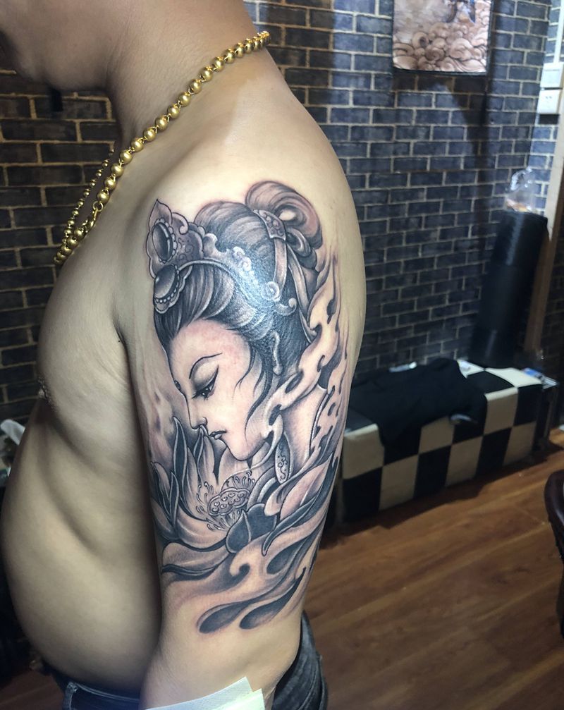 当前位置: 首页 >山东省济南市纹身店-济南皇家烈焰刺青纹身图案>花旦艺姬纹身图片_肩部新传统花旦艺姬纹身图案