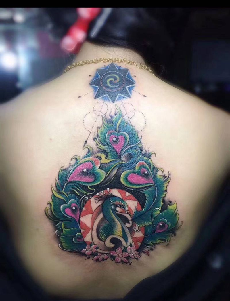 孔雀➕修改上边老图添加纹身图片_背部水彩孔雀纹身图案