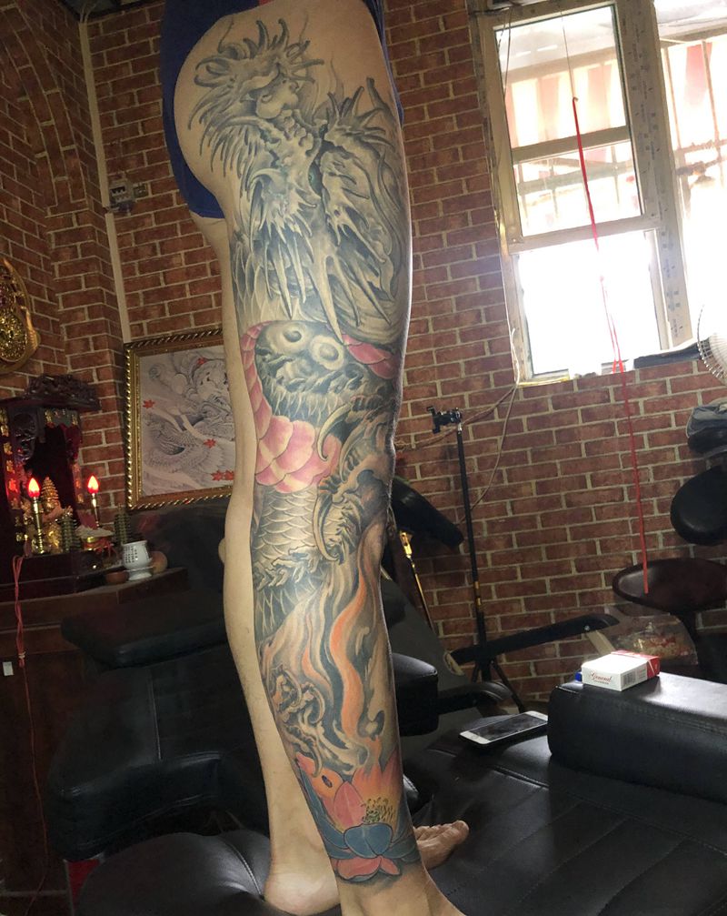 • T网红王老大花腿龙纹身图片_腿部新传统纹身图案