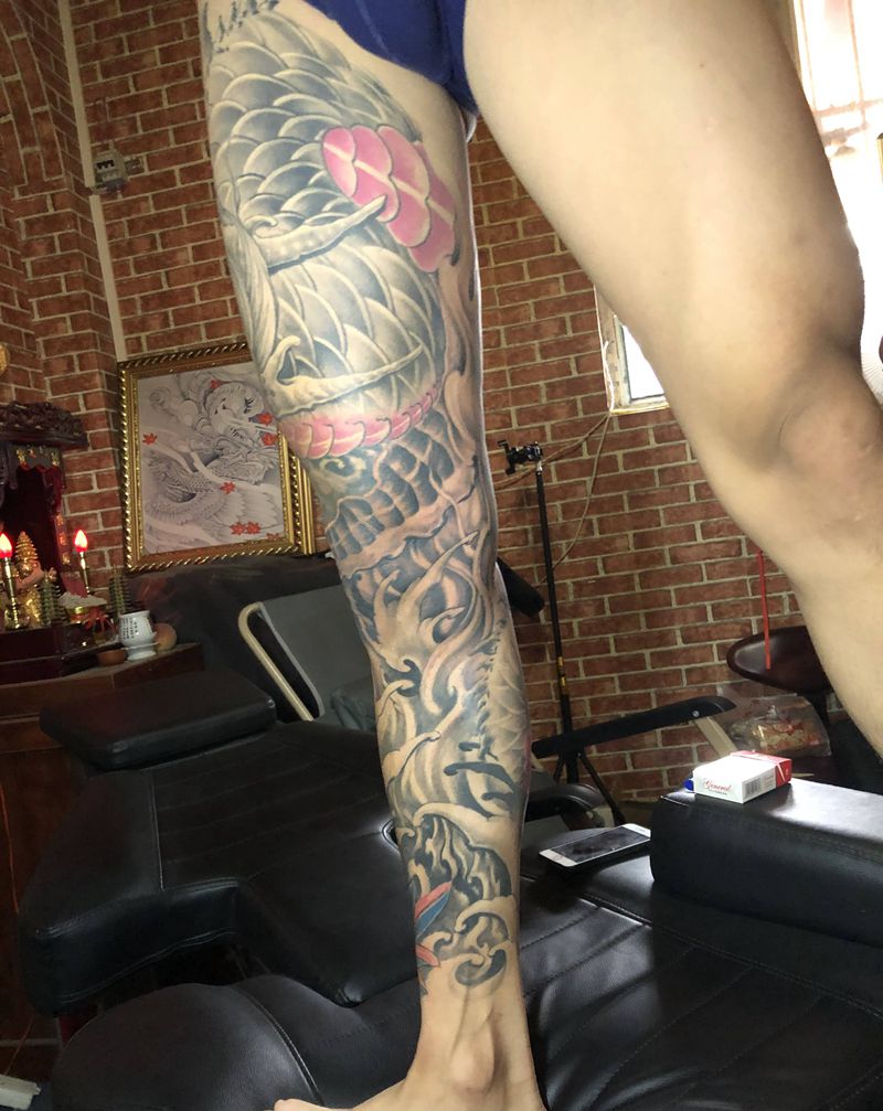 • T网红王老大花腿龙纹身图片_腿部新传统纹身图案