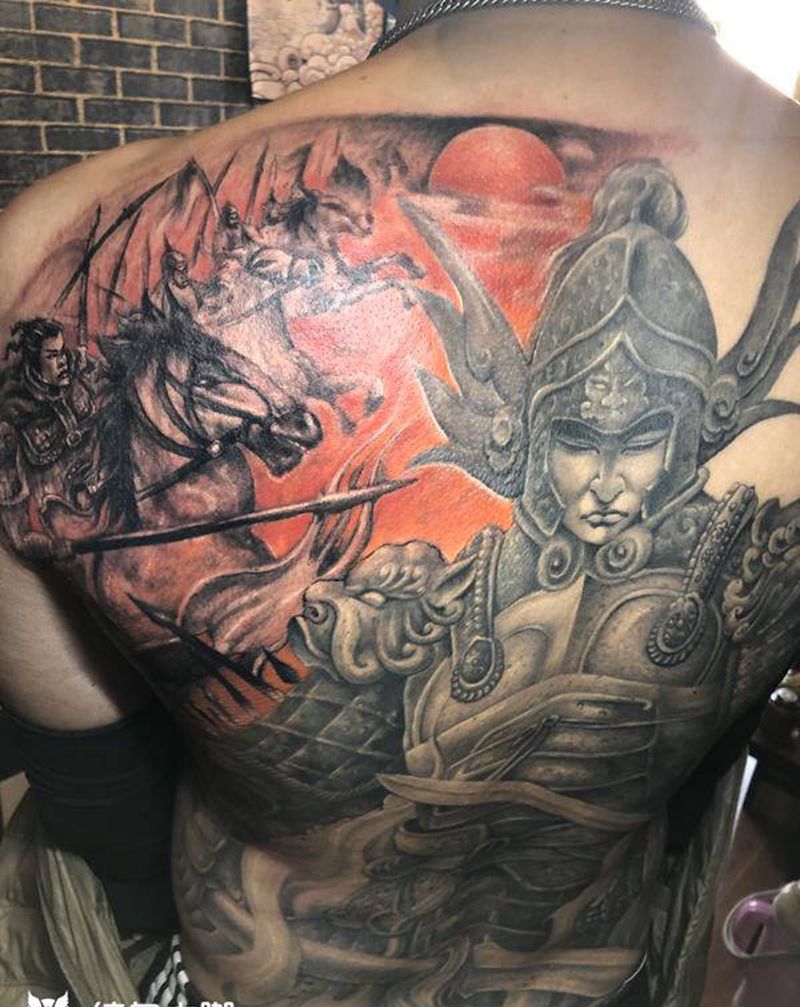 战神子龙纹身图片_背部新传统三国人物纹身图案