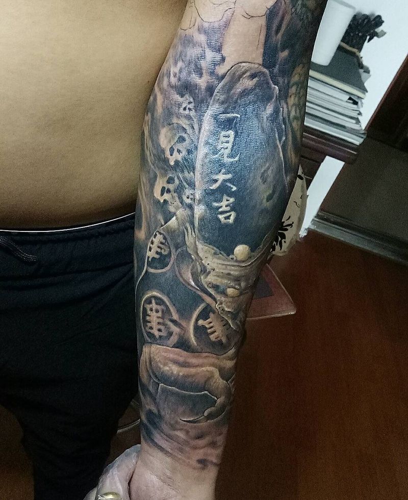 当前位置: 首页 >山东省济南市纹身店-济南皇家烈焰刺青纹身图案>花臂添加黑白无常纹身图片