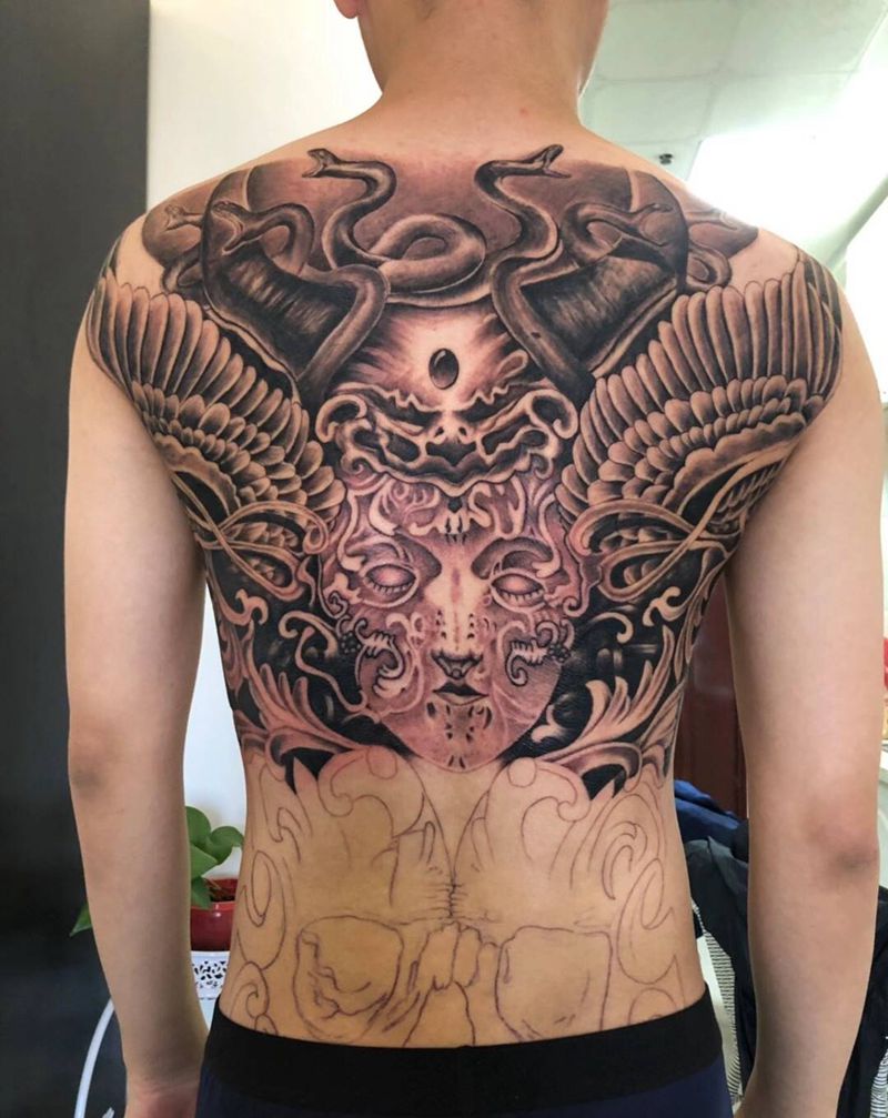 黑灰满背纹身图案