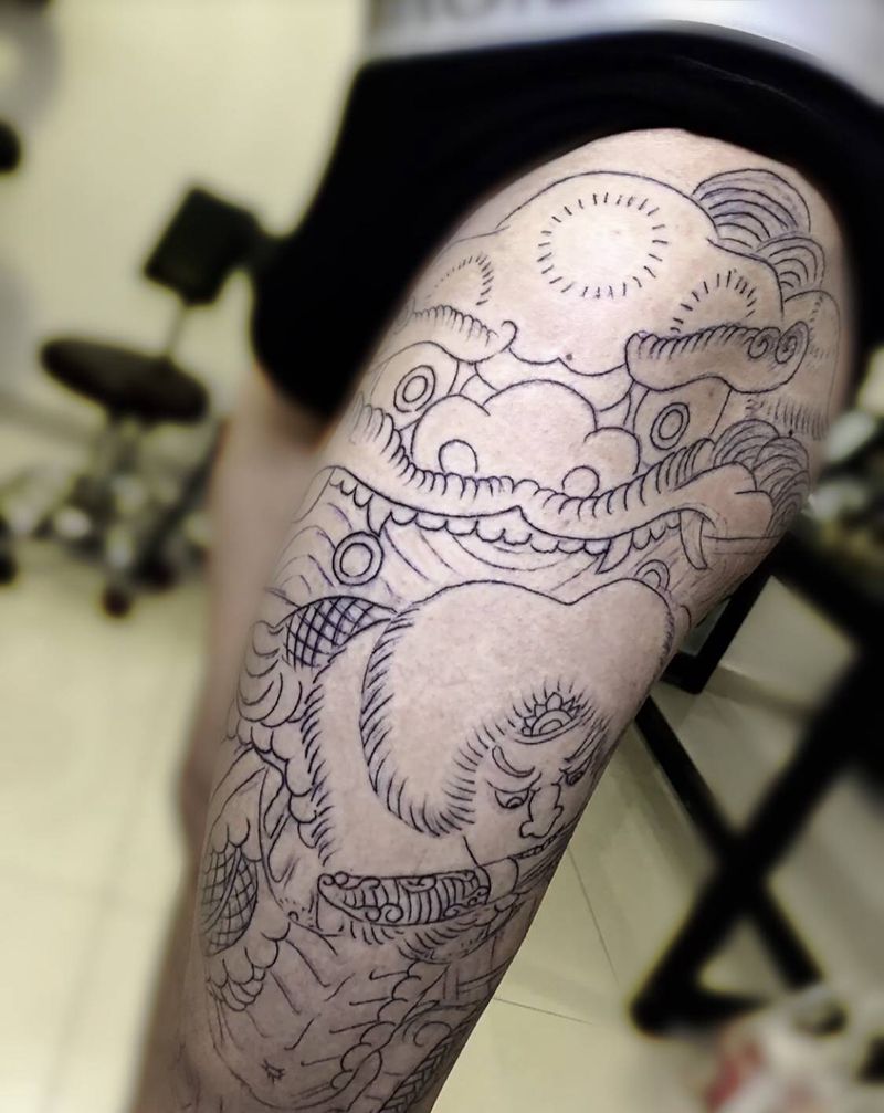 • T网红王老大花腿龙纹身图片_腿部新传统纹身图案