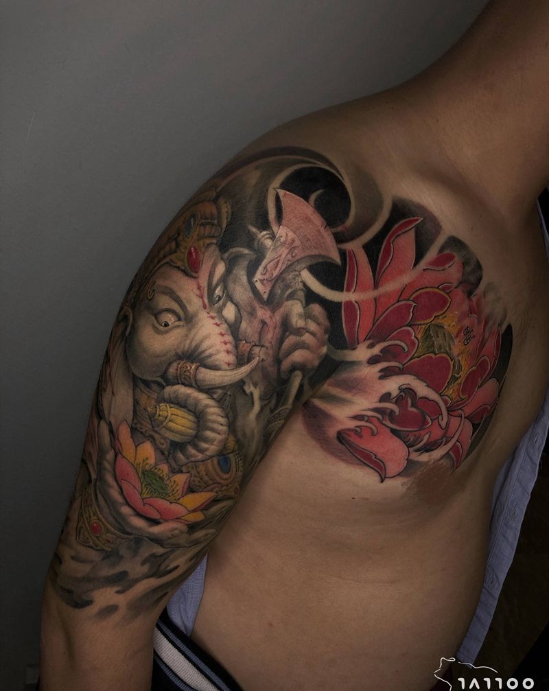 当前位置: 首页 >山东省济南市纹身店-纹豪刺青纹身图案>半甲纹身图片_肩部胸部纹身图案