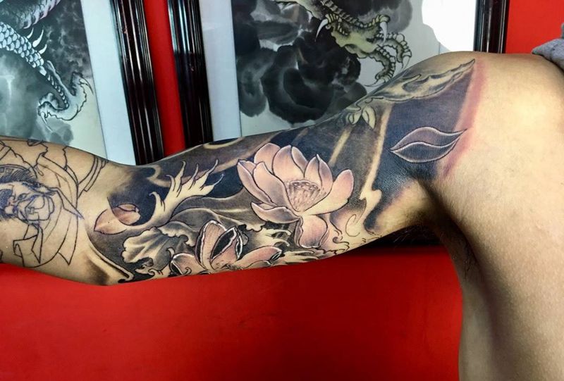 当前位置: 首页 >山东省济南市纹身店-纹豪刺青纹身图案>黑白莲花纹身图片_成品手臂手部传统国画习俗几何植物静物图腾纹身图案