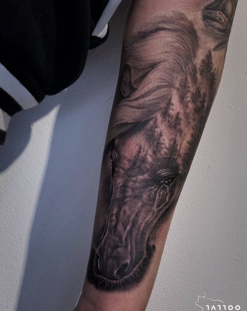 当前位置: 首页 >山东省济南市纹身店-纹豪刺青纹身图案>小马纹身图片_手臂欧美写实纹身图案