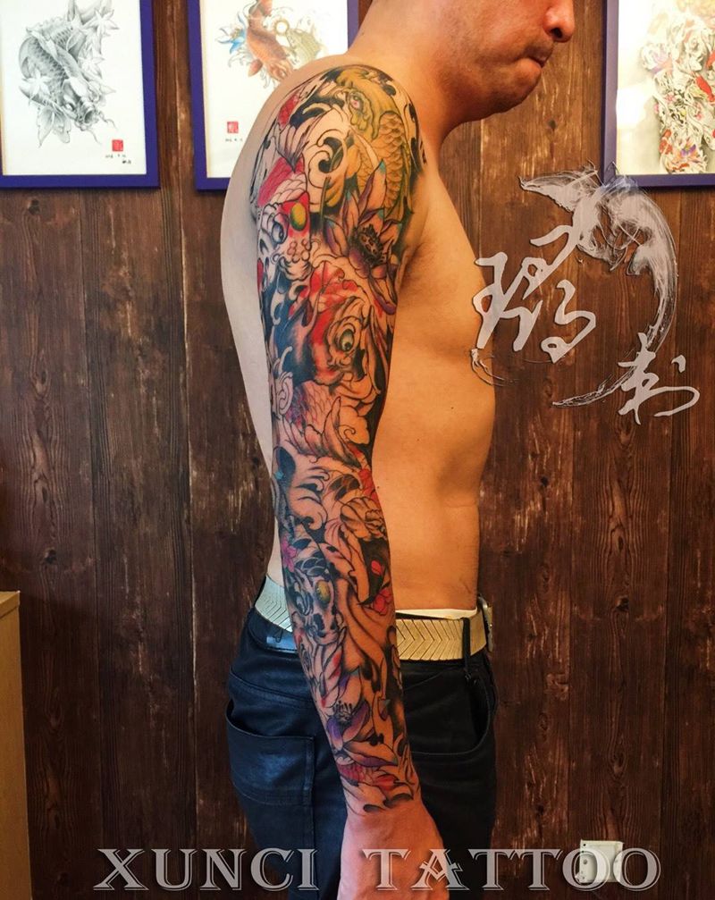 当前位置: 首页 >山东省济南市纹身店-倧玥刺青纹身图案>整臂九鲤纹身图片_成品手臂肩部传统动物写实国画纹身图案