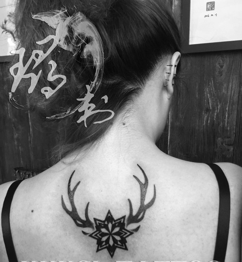 当前位置: 首页 >山东省济南市纹身店-倧玥刺青纹身图案>情侣鹿角图案纹身图片_成品背部肩部欧美清新字符几何动物静物原创纹身图案