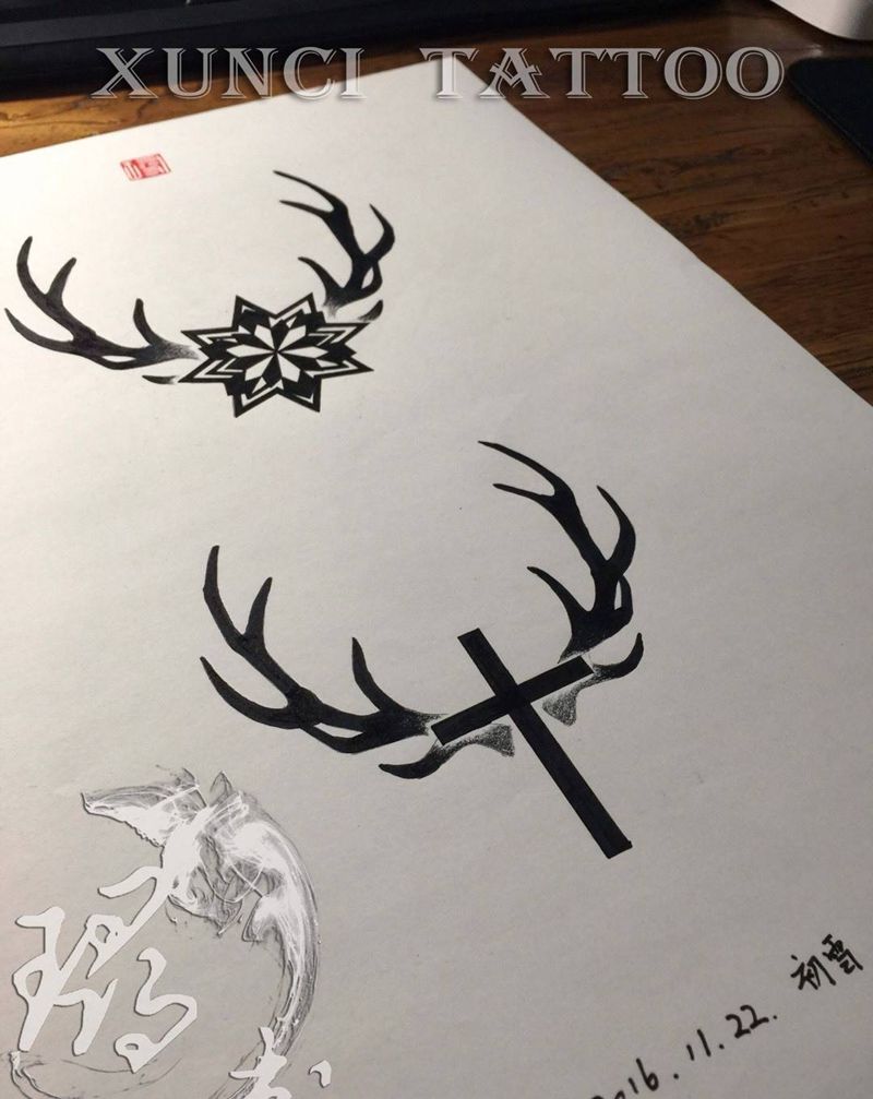 当前位置: 首页 >山东省济南市纹身店-倧玥刺青纹身图案>情侣鹿角图案纹身图片_成品背部肩部欧美清新字符几何动物静物原创纹身图案