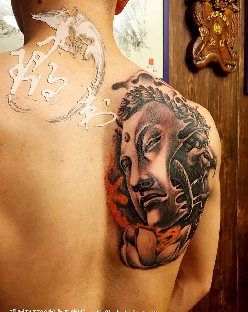当前位置: 首页 >山东省济南市纹身店-倧玥刺青纹身图案>佛魔纹身图片_成品肩部传统写实肖像鬼神人物背部纹身图案