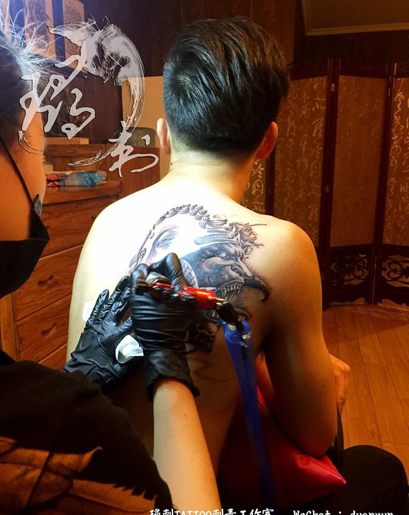 当前位置: 首页 >山东省济南市纹身店-倧玥刺青纹身图案>佛魔纹身图片_成品肩部传统写实肖像鬼神人物背部纹身图案
