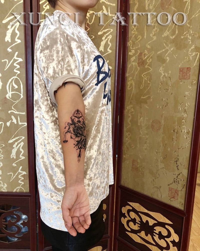 天秤$蔷薇纹身图片_成品手稿手臂欧美传统贴纸几何植物原创臀部纹身图案