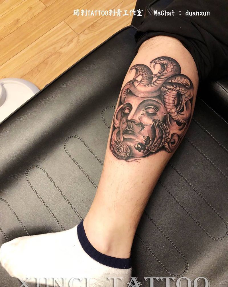 Medusa纹身图片_成品手稿腿部欧美肖像写实人物鬼神宗教动物纹身图案